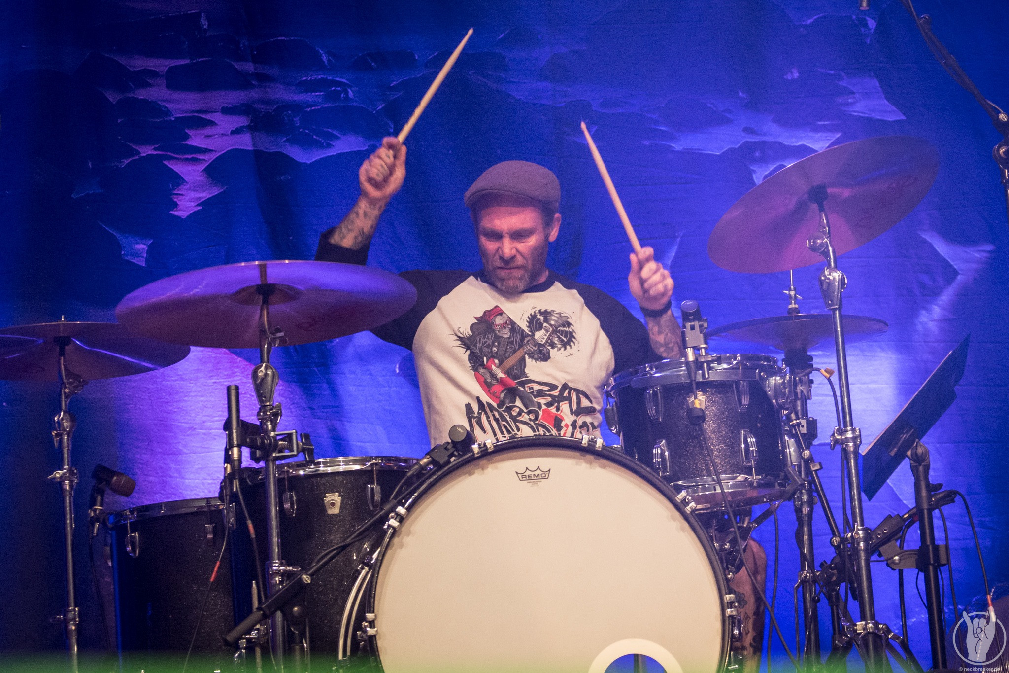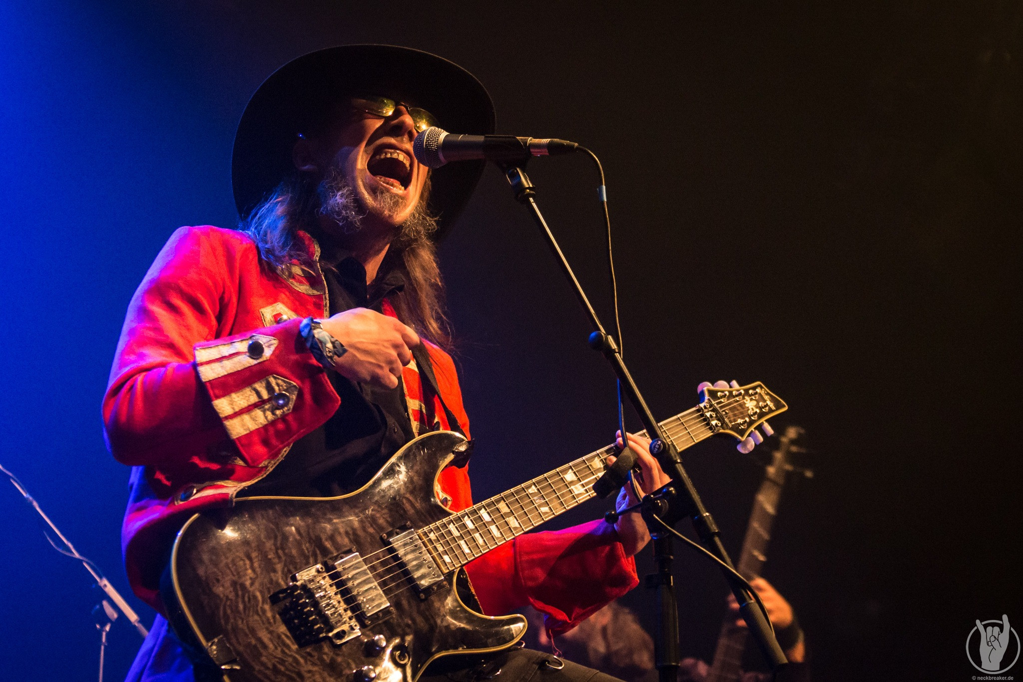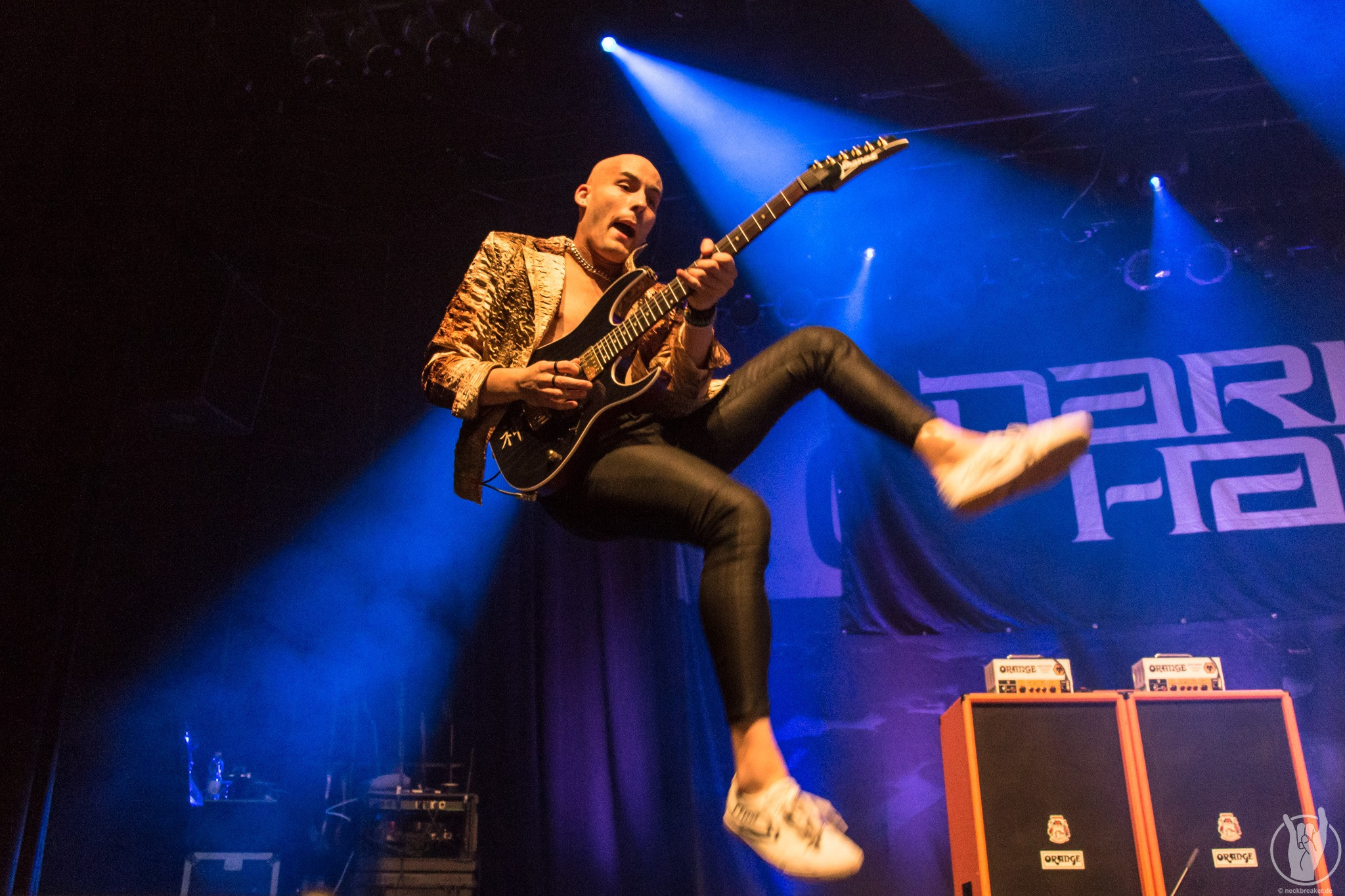 Dass die pure Spielfreude der Band keine Show ist, wird mehr als deutlich, als beim vierten Song zusätzlich zum Bassisten Jimmy Wynen seine Vertretung auf die Bühne kommt und auf der Gitarre ein unfassbar gutes Solo abreißt, nur um anschließend als großartiger Bassist gelobt zu werden (Anm. d. Red.: Ironie) . Jimmy musste wohl für ein paar Tourtermine aussetzen und wurde am Bass vertreten. Weiterhin spricht Danny Ritz das Publikum in fast perfektem Deutsch an und leitet damit in die finalen Songs über.