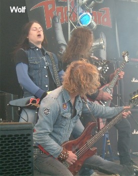 Drei hervorragende Heavy Metal-Scheibletten der alten Schule haben die schwedischen WOLF im Gepäck, aber auf hiesigen Festival-Bühnen haben sie mich bislang nicht so recht überzeugt. Auf dem Wacken 2002 dürfte das in erster Linie an ihrem augenscheinlich hoch alkoholisierten Zustand gelegen haben, auf diesem Rock Hard Festival hingegen war es der angeschlagenen Gesundheitszustand von Frontman Niklas Olsson, der ein wenig die Freude trübte. Denn der auf Platte äußerst charismatische Sänger konnte auf der Bühne an diese Leistungen zu keinem Zeitpunkt ranreichen und musste weitaus tiefer und mit wenigen Gesangslinien arbeiten, um den Gig überhaupt zu überstehen. Dazu kam noch ein ziemlich bescheidener Sound, der es erschwerte, die eigentlich sehr eingängigen Songs wie "Electric Raga", "Demon Bell" oder "Evil Star" gebührend zu würdigen. Aber trotz dieser erschwerten Bedingungen liessen sich die vier jungen Schweden den Spaß nicht verderben, posierten wie die Weltmeister und waren zumindest musikalisch voll auf der Höhe – so viel man es halt bei diesem Soundbrei mitbekommen konnte. Wirklich schade, aber wahrscheinlich sind WOLF eh irgendwie besser in kleineren Clubs mit großer Fannähe aufgehoben als auf ausladenen Festivalbühnen. (Kai)