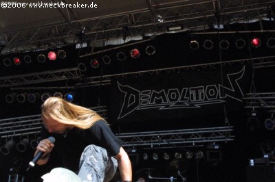 „Mir saan Demolischn aus Östreich“. Freundlicherweise übersetzte DEMOLITION Sänger Wolf seine Aussagen stets auch ins Deutsche, so dass anstatt bedächtiger Stille auch mal Applaus von den 100-200 Anwesenden zu hören war. Der Death/Thrash der Ösis war relativ unspektakulär, überzeugte aber durch die Spielfreude der Band, die leider ohne ihren zweiten Gitarristen anreisen mussten. Zum Wachwerden ne gute Sache, wenn auch der Auftritt trotz guter Performance nicht wirklich vom Hocker riss. (Bernie)