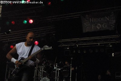 Ui, HIDDEN IN THE FOG werden sich schätzungsweise nicht so viele neue Freunde mit ihrem sehr sperrigen, avantgardistischen Black Metal gemacht haben. Ehrlich gesagt war die Performance doch für die meisten, einfachen Ohren eher grausam anzuhören. Der cleane Gesang von Frontmann Ghash war zu anstrengend, wenn auch nicht falsch. Der unpassende Keyboardteppich tat sein Übriges. Die Musiker haben ihre Hausaufgaben gemacht, schaffen es aber irgendwie nicht, ihre Lösungen zusammen zu bringen, dass daraus gut hörbare Musik wird. HIDDEN IN THE FOG wollen wohl Kunst machen und wie es bei Kunst nun mal so ist, meistens nur für Liebhaber. Genau wie hier. Nur für echte Fans. (Bernie)