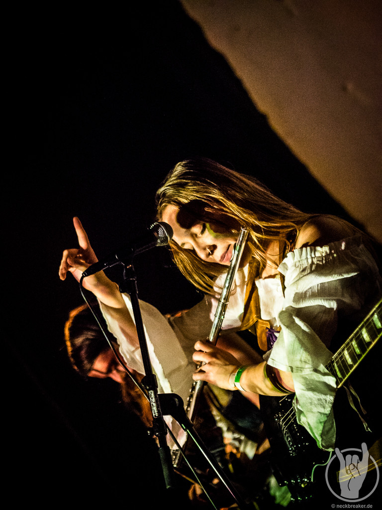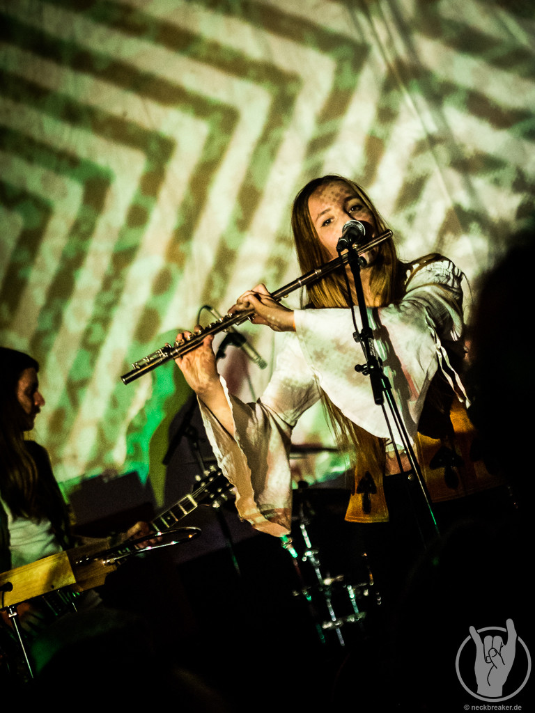 FAUN mochte ich immer ganze gerne, auch wenn ich mich jetzt nicht als super Fan bezeichnen würde. In den letzten Jahren habe ich sie aus unerfindlichen Gründen etwas aus den Augen verloren, daher wollte ich sie nun unbedingt sehen, wenn sie schon so nah auftreten. Pflichtbewusst habe ich mir auch gleich das neue Album gekauft, damit wir an dem „aus den Augen verlieren“ arbeiten können. FAUN sind eine Band, zu deren Musik man sich wegträumen kann, aber sie ist auch sehr tanzbar. Entsprechend doof gucke ich aus der Wäsche, als ich in die Neue Gebläsehalle komme und den Saal bestuhlt vorfinde. Was soll das denn? Ich bin so verwirrt, dass ich erst mal nicht kapiere, dass die Stühle auch noch markiert sind und es keine freie Platzwahl gibt. Nun gut.