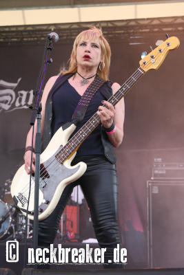 Die Eröffnung des Wochenendes übernahmen SANHEDRIN. Eine gute Wahl wie ich finde, denn die New Yorker haben nicht nur vier Top-Alben in der Hinterhand, sondern sind auch stilistisch mit ihrem traditionellen Metal so ausgerichtet, dass sich damit wohl jeder anfreunden kann. Sängerin und Bassistin Erica Stoltz gab mit ihrem kraftvollem Gesang auch gleich mal die Richtung für das Wochenende vor und legte die Messlatte auf eine üppige Höhe.